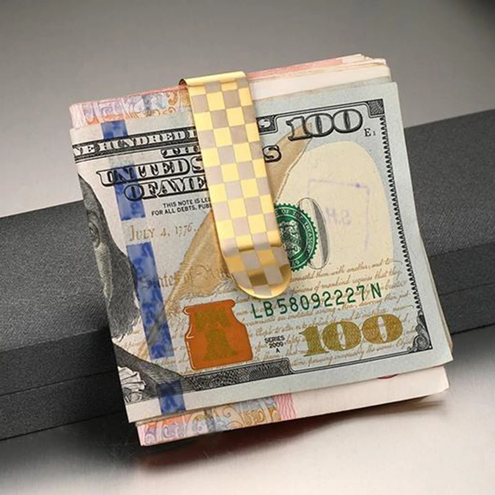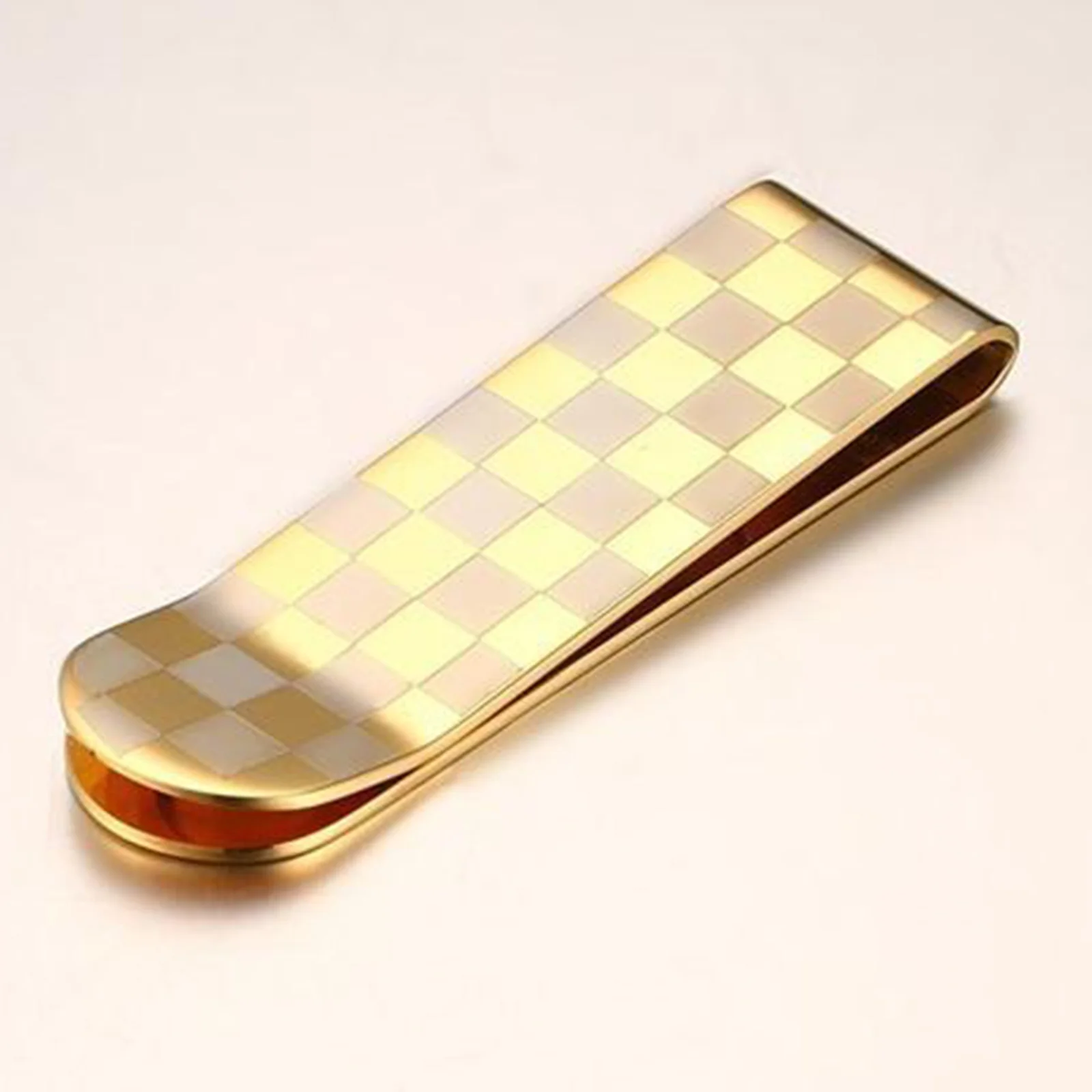 Gold Stainless Steel Money Clip – Luxury Slim Cash & Card Holder (Checkered Design)